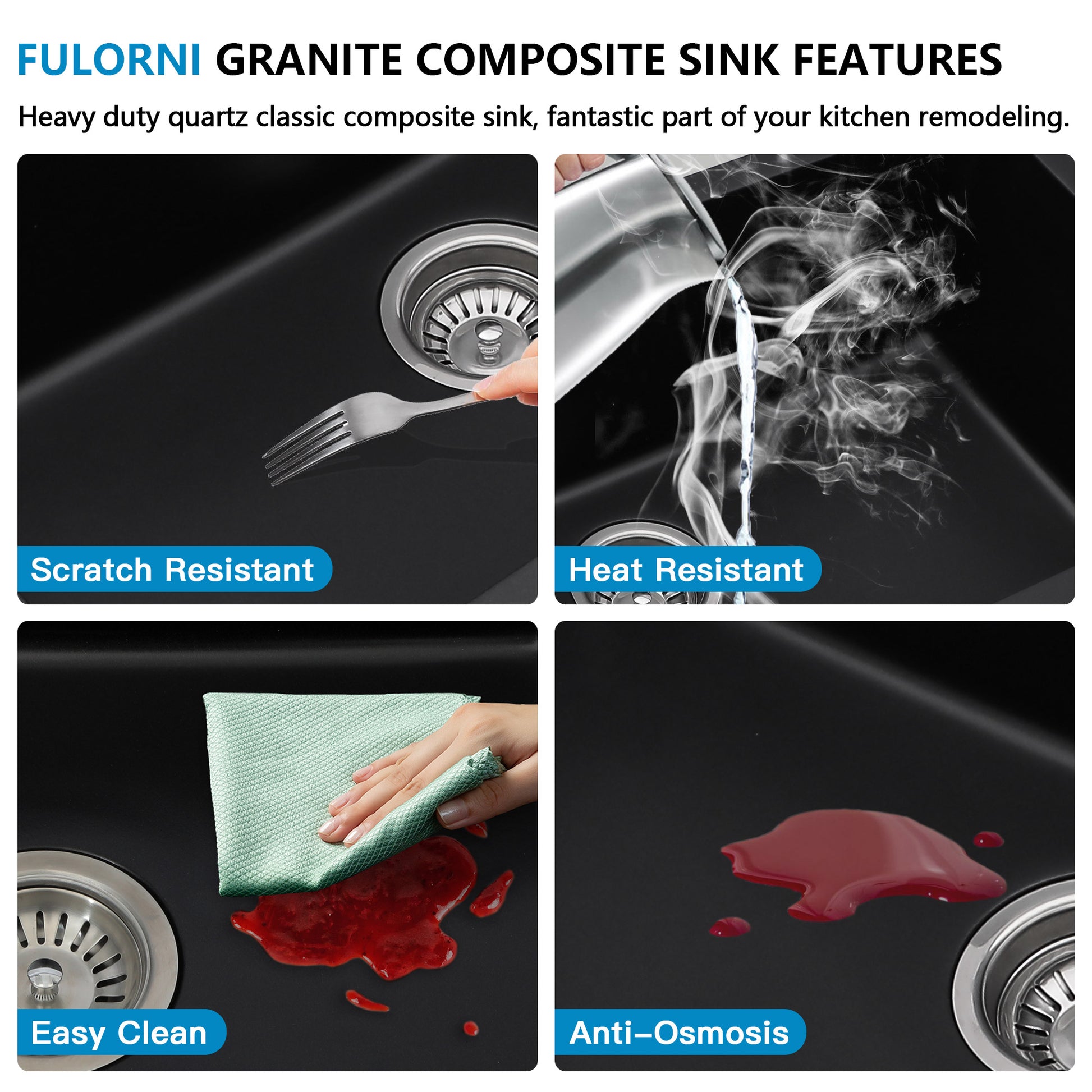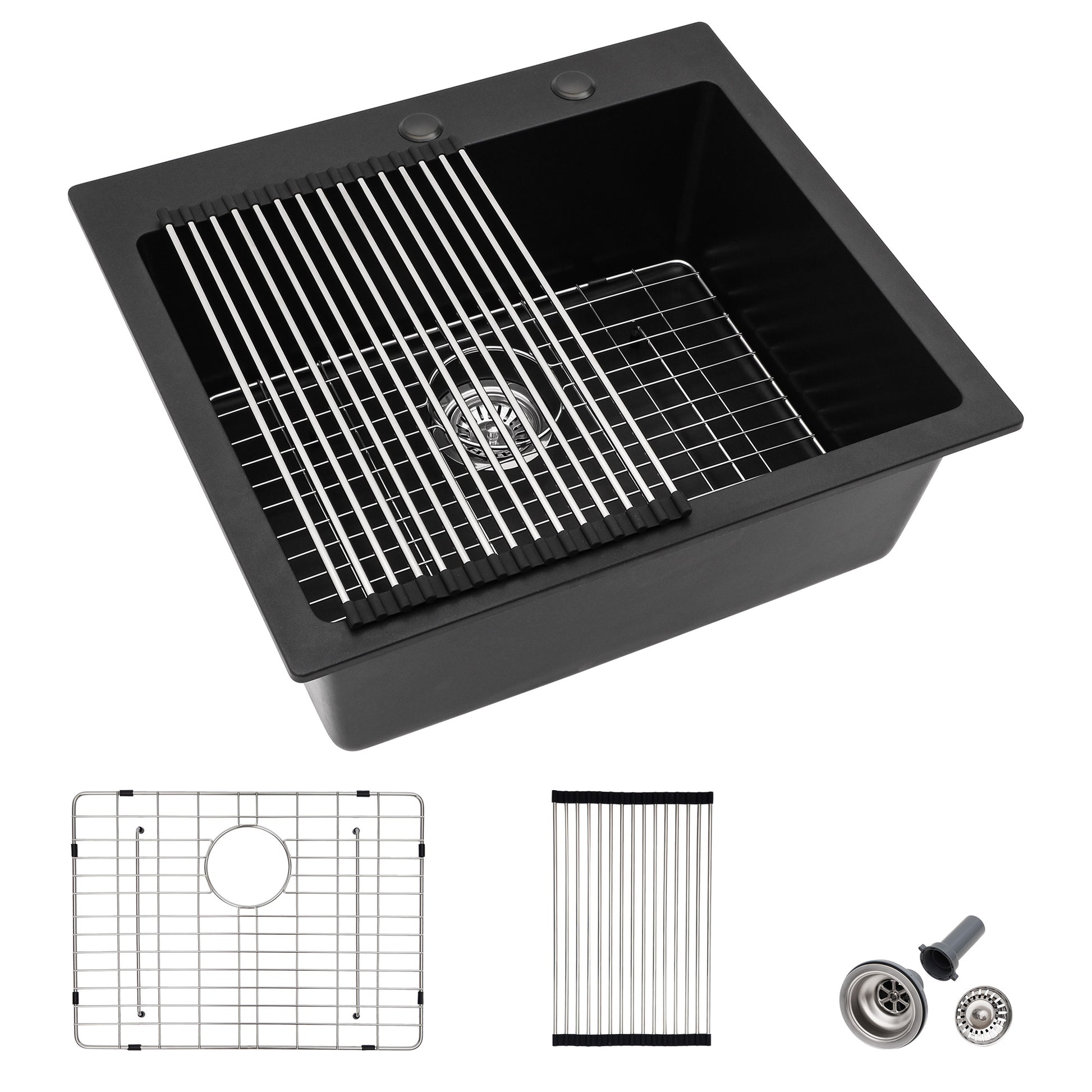 25 Granite Composite Kitchen Sink - Fulorni 25"×22" Granite Kitchen Sink Drop In Topmount Matte Black Quartz Classic Above Counter Single Bowl Sink Basin