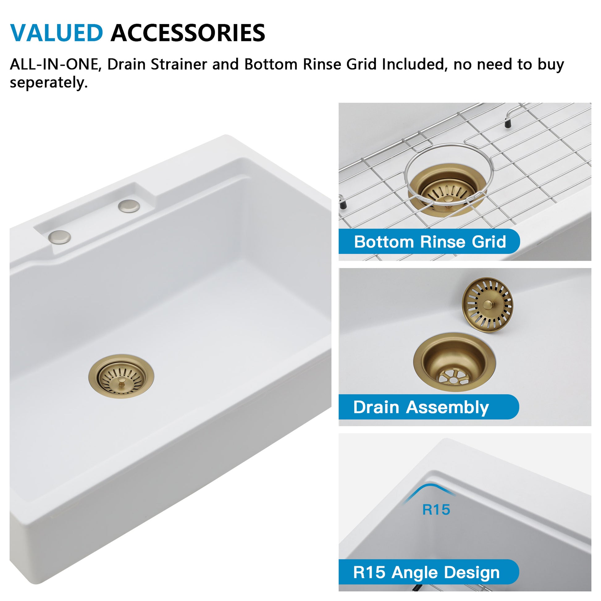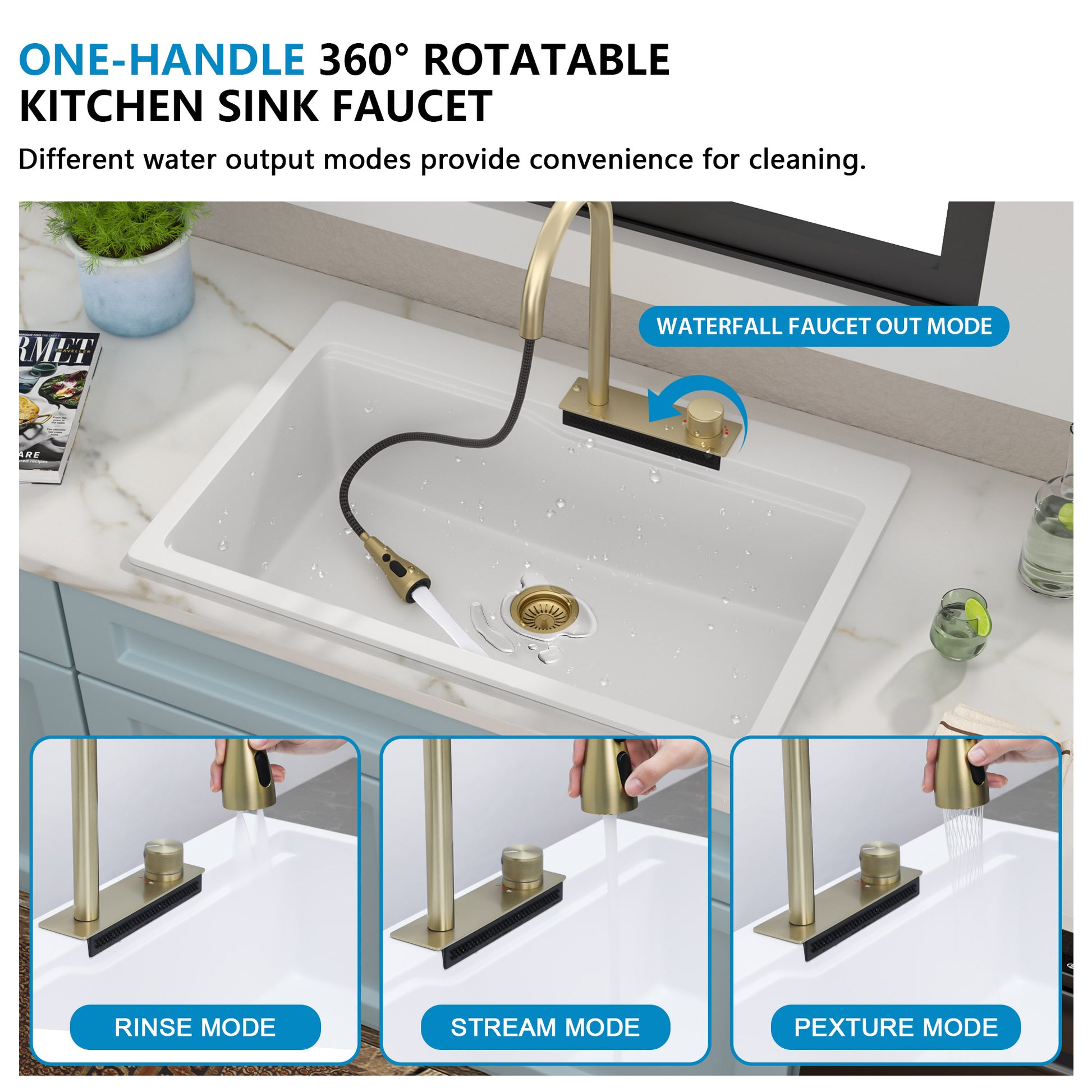 33"x22" Granite Waterfall Kitchen Sink Multifunctional Smart Workstation With Faucet Combo Drop In Topmount White Granite Composite Quartz Classic Above Counter Single Bowl Sink Basin